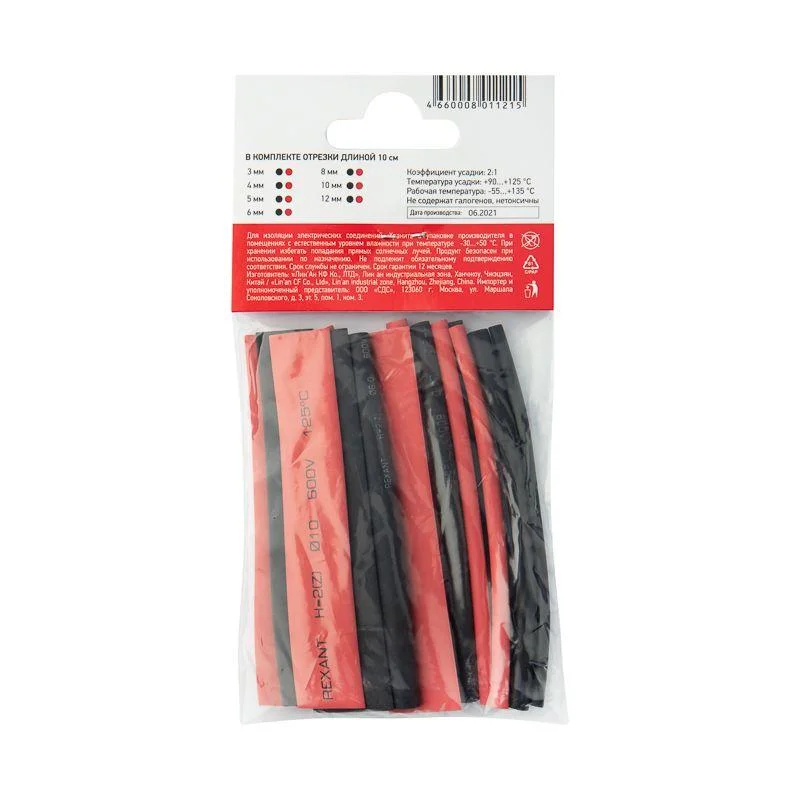 Термоусаживаемые трубки MAхIMUM 2:1 REхANT оптимально подобран для использования в любых ситуациях. Назначение: для восстановления поврежденной и создания новой изоляции, герметизации поверхностей электрических соединений кабелей и проводов, бандажирования и маркировки проводов, для создания антикоррозийных защитных и декоративных покрытий Состав набора: 3мм – 2шт(красный, черный) 4мм – 2шт(красный, черный) 5мм – 2шт(красный, черный) 6мм – 2шт(красный, черный) 8 мм – 2шт(красный, черный) 10 мм – 2 шт(красный, черный) 12 мм – 2 шт(красный, черный) 1. Длина: 10 см. 2. Коэффициент усадки 2:1. 3. Температура усадки: +90°C…+125°C 4. Рабочая температура: -55°…+135°C 5. Не содержет галогенов 6. Нетоксично Отличается высокой гибкостью; материал(полиолефин), из которого изготовлена трубка, экологически безопасен. Уникальным свойством термоусаживаемых трубок является их способность менять свой диаметр, сжиматься в результате нагрева и принимать форму предмета или материала, на который совершается усадка, для этого достаточно нагреть трубку до необходимой температуры, а потом дать остыть. Трубка имеет свойство подавления горения, то есть она неспособна поддерживать горение, в отсутствии открытого огня затухает самостоятельно и неспособна воспламеняться. Рекомендуется проведение работ по усадке трубок с помощью специальных электромонтажных фенов и газовых горелок REхANT.